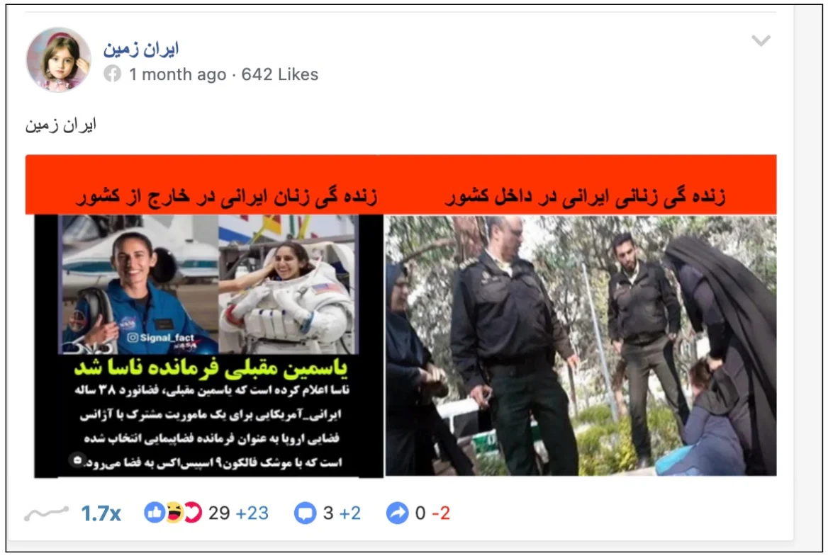 For example, some ‘Iranian’ Pentagon bots and trolls promoted “hardliner” views, criticising the Islamic Republic for being too liberal domestically, and inadequately aggressive in asserting its interests regionally. Others posed as left-wingers, secularists and other opposition elements. It was a full-spectrum digital assault from every angle. Eerily, many of these accounts promoted women’s rights, and protests against hijab-wearing. One Pentagon-circulated meme compared the treatment of women abroad with Iran, by contrasting photos of Western female astronauts and an alleged local victim of violent domestic abuse.